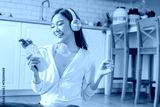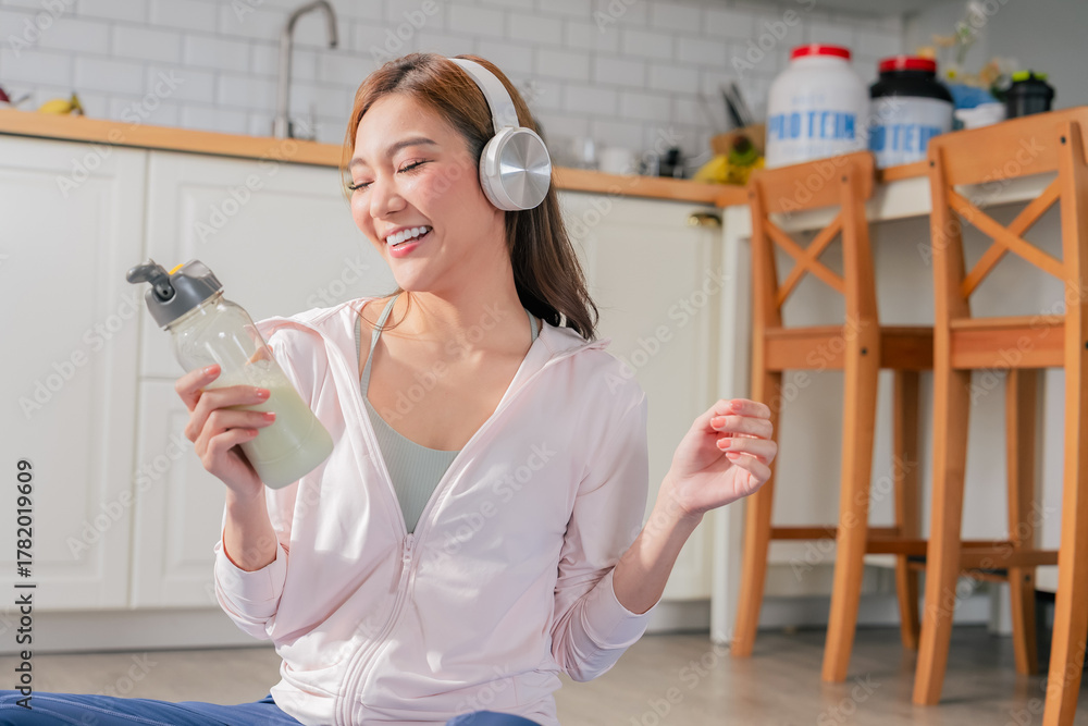 beautiful Asian woman enjoys healthy lifestyle at home wearing sporty activewear listening music through headphones drinking nutritious protein milkshake yoga relaxed atmosphere reflects modern life