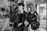 Stylish couple enjoys a cozy moment together at a vibrant cafe during a sunny afternoon