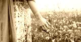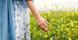 Hands, flowers and woman in field, nature and environment with journey, calm and vacation. Outdoor, plants or person with adventure, earth day and summer holiday with tourist, walking and countryside