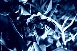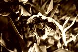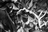 Close-up of Paphiopedilum orchid with yellow and brown spotted petals surrounded by green leaves in natural light.