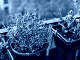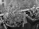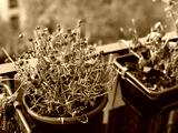 Flower pot with dried pink marguerite flowers in balcony garden close up in autumn time