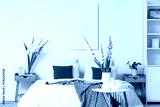 Interior of light bedroom with tables and gladiolus flowers in vases