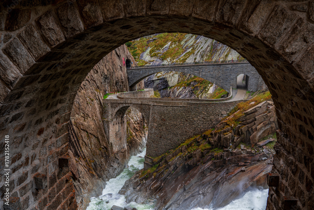 View of the Devil's Bridge in the Alps near Andermatt in Switzerland.
