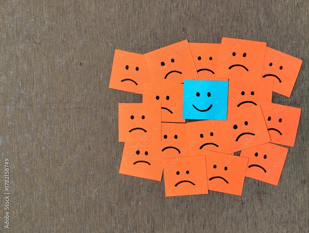 Hand drawn sad faces emoji on sticky notes with on that stands out in a smile emoji, positive way concept
