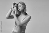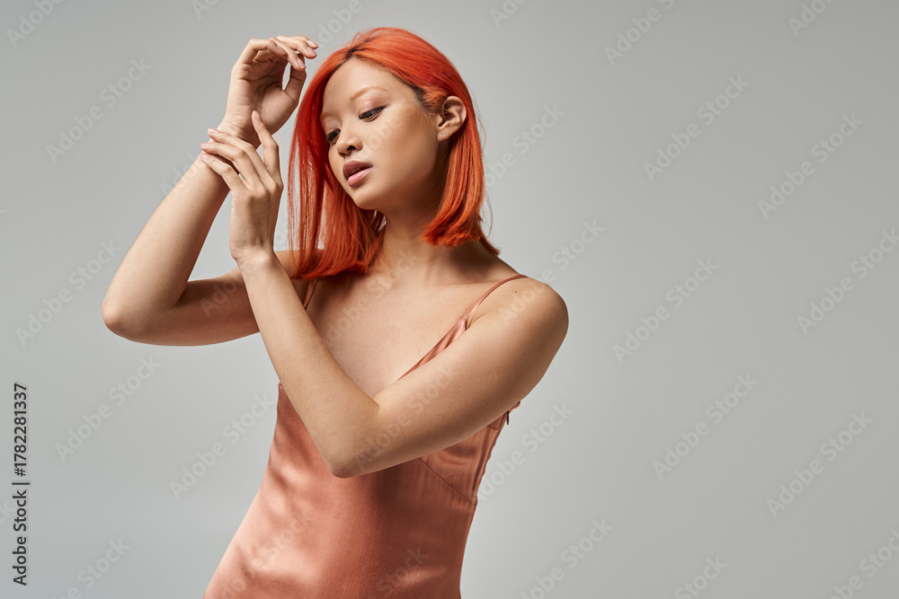 Elegant portrait of a young woman with striking red hair in a flowing silk dress