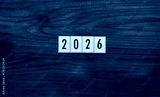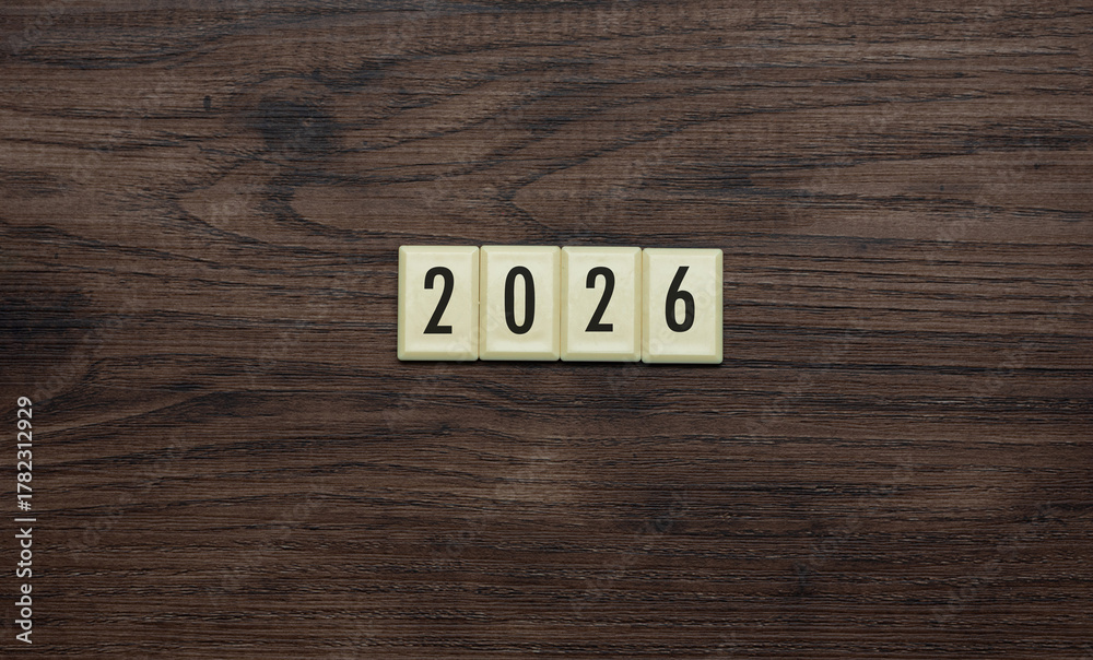 The year 2026 spelled out using retro-style number tiles centered on a dark wooden surface, symbolizing the upcoming new year.