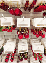 Decorative women's jewelry earrings in the form of red cherries and strawberries with shiny stones on sale in the store