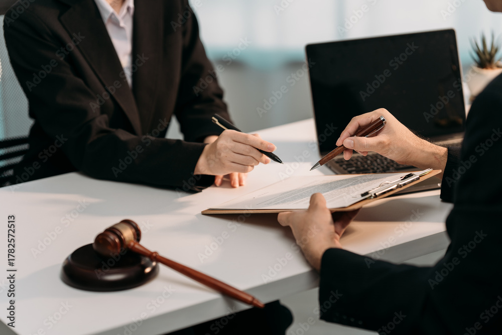 Negotiating Legal Matters: A pair of legal professionals engaged in a crucial signing ceremony, as they navigate the intricacies of a legal agreement.