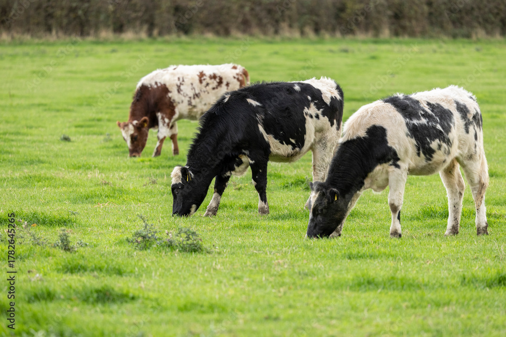 Pasture Grazing Cows in Green Field, Black and White Herd Emphasizing Rural Farm Life
