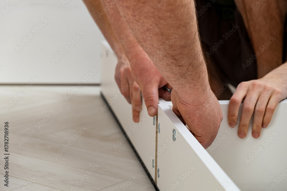 Young man assembling modern furniture at home, DIY lifestyle and cozy interior vibes