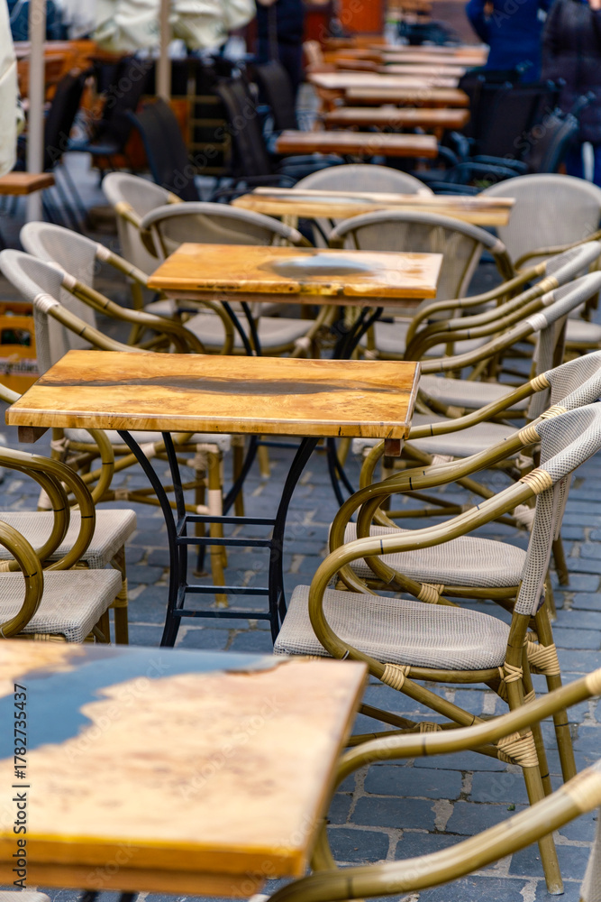 Outdoor cafe with empty wooden tables and chairs on the patio. Inviting relaxation and leisurely moments.