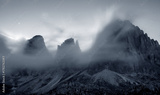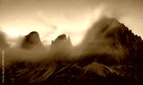 View of the Langkofel group embraced by clouds at sunset in South Tyrol, Italy.