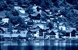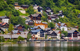 Hallstatt, Austria. View to Hallstattersee Lake and Alps mountains. Old houses at lake banks.