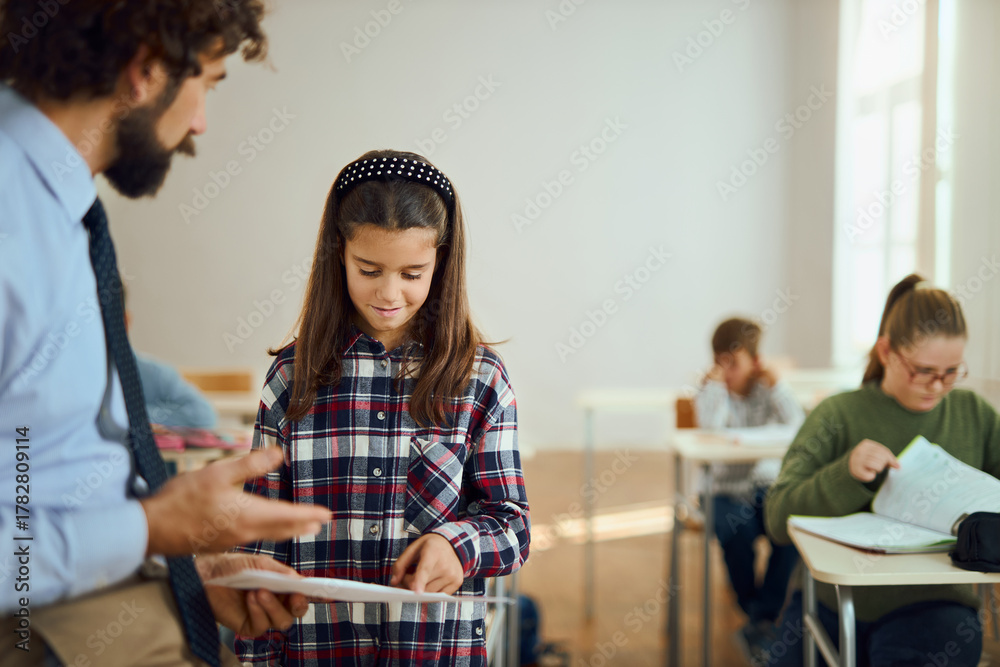 Sad elementary student talking to teacher while taking test results on a class in the classroom.
