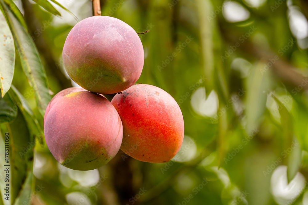 Fresh Mango Fruits Growing on Tree in Tropical Florida Garden