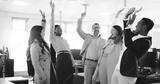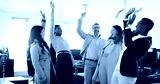 Corporate, people and hand stack in office for motivation, teamwork and celebration of success. Smile, staff and partnership for agreement, collaboration and solidarity support of company achievement