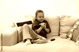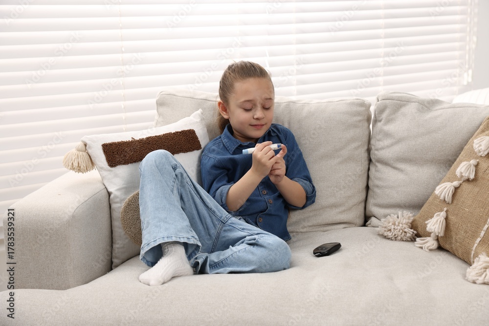 Diabetes. Little girl checking blood sugar level with lancet pen on sofa indoors