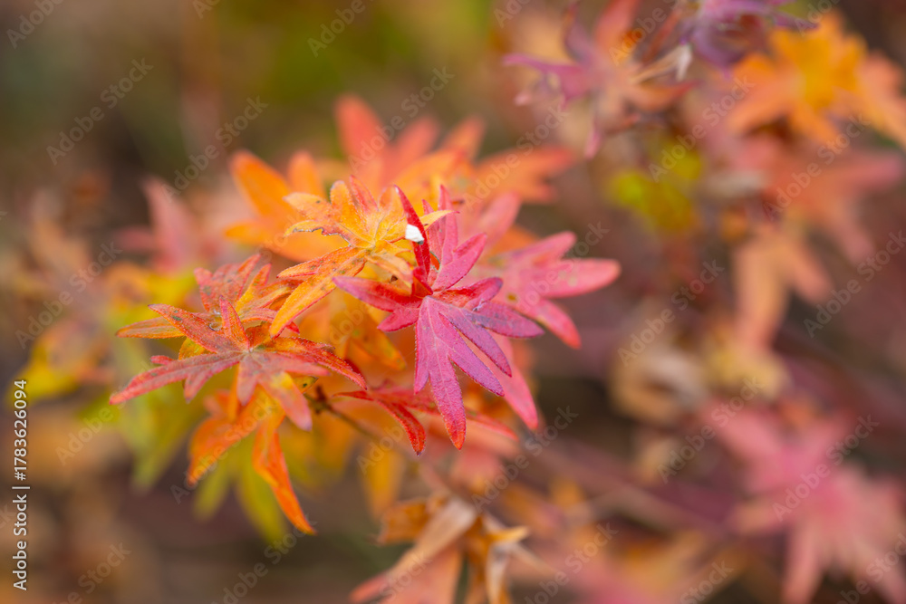 Autumn red, yellow and orange leaves of the geranium 'Max Frei' in the garden, colorful background or wallpaper