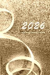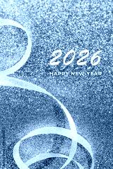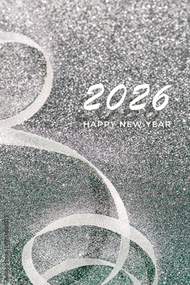 New Year Card With Silver Glitter Background With Ribbon And 2026 Happy New Year Text. Concept Of New Year Holiday Celebration, Party Invitation Design, And Festive Visuals For Seasonal Marketing