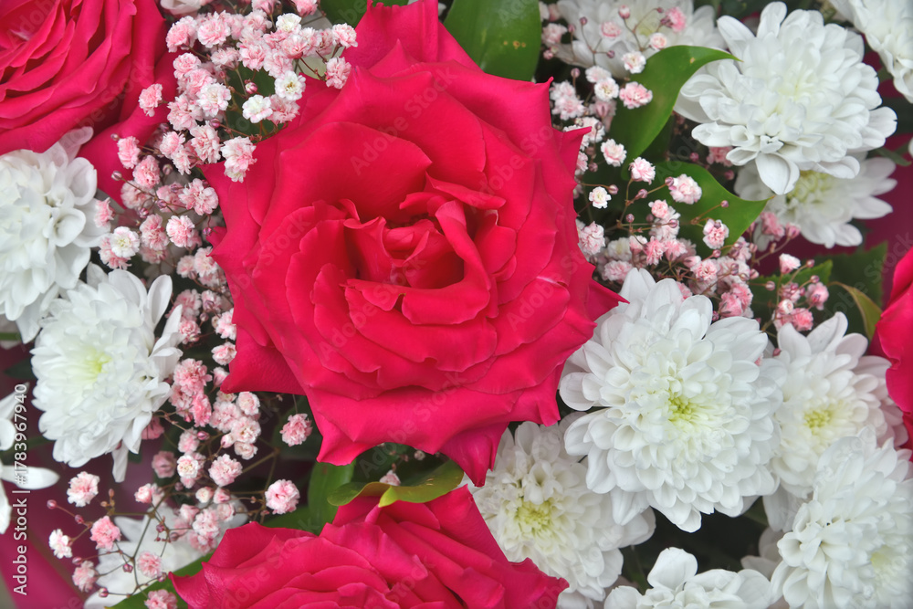A bouquet of red roses, white chrysanthemums and small pink gypsophilas