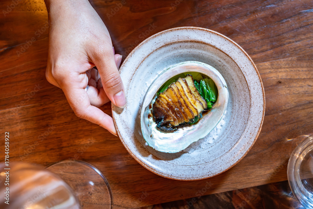 Gourmet Abalone Dish Served in Shell on Rustic Wooden Table