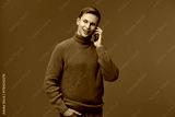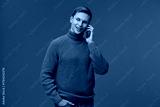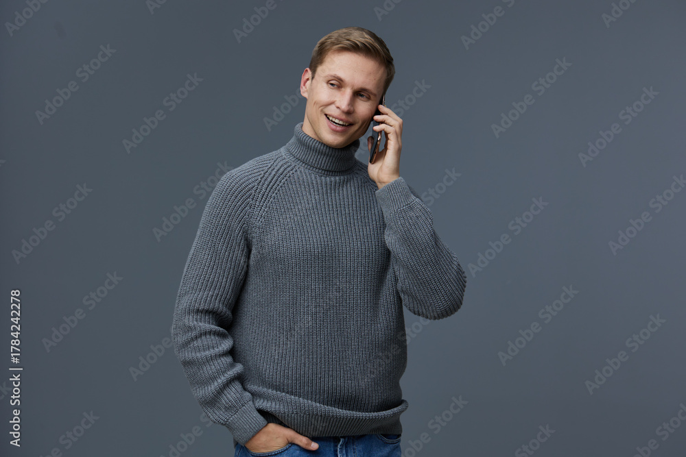 Smiling young man wear grey turtleneck sweater use mobile phone for video call digital nomad concept isolated dark background