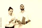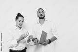 A professional man and colleague stand against an isolated color background, the man holds a tablet while the woman points, showcasing teamwork, focus, and confidence in a business setting.
