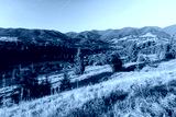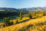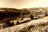 Vibrant mountain landscape at sunset with rolling hills and villages in the distance. Location place Carpathian mountains, Ukraine, Europe.