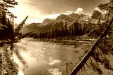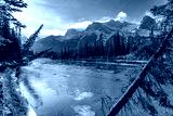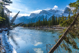 Natural scenery in early winter season sunny day morning. Drift ice floating on Bow River. Clear blue sky, snow capped Mount Lawrence Grassi in background. Landscape in Town Canmore, Alberta, Canada.