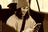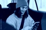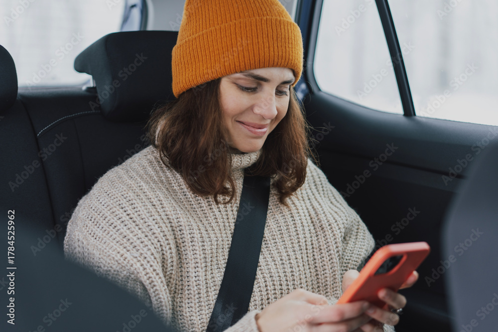 Young smiling caucasian woman using smartphone in back passenger seat during winter car trip