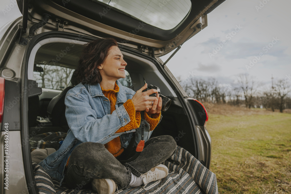 Young happy woman sitting in an open car trunk taking pictures with a camera. Travel by car