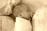 A cute newborn is sound asleep. The baby is wrapped in a white blanket and has a blue pacifier in its mouth. Pillows surround the sleeping infant in its crib