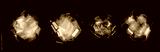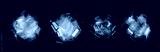 Four abstract piles of transparent adhesive tape on a black background. Clear tape pieces are crumpled and layered into sculptural shapes, showing reflections, dust, and texture.