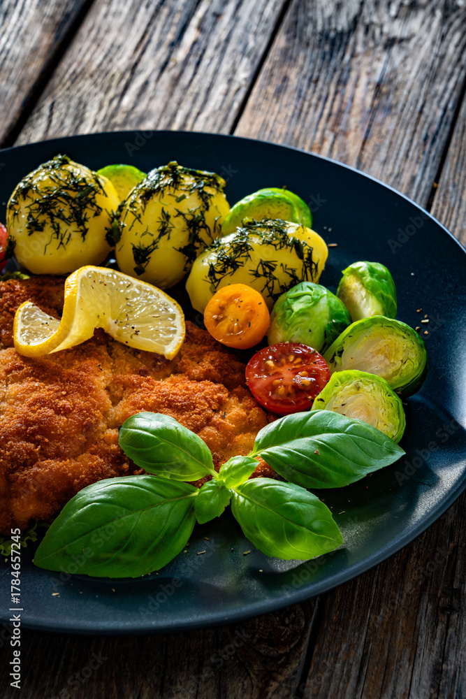 Crispy breaded chicken cutlet with boiled potatoes and Brussels sprouts on wooden table