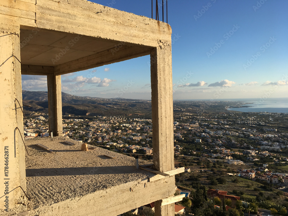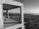 Unfinished concrete frame overlooking coastal valley. Progress, perspective, and transformation between creation and emptiness.