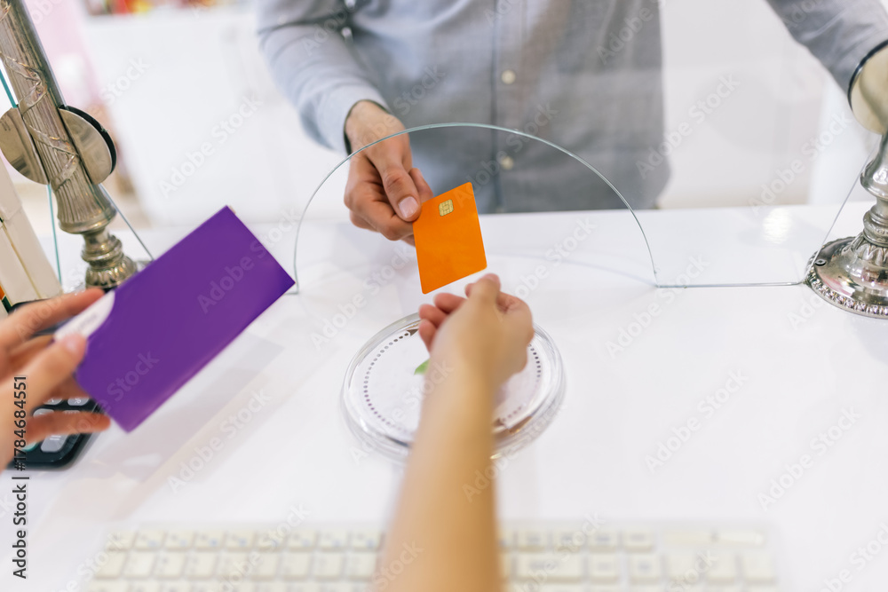 Customer paying by card at pharmacy counter