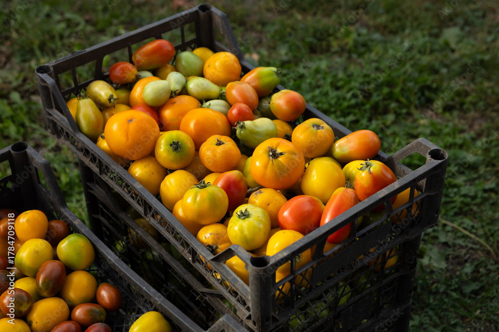 Top view of a crop of ripe and unripe tomatoes in crate outdoor