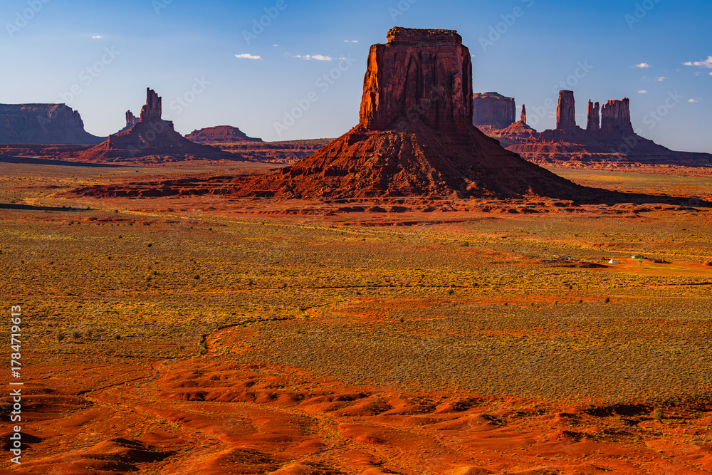 The red rock desert and spires of scenic drive in Monument Valley Navajo Tribal park in Arizona United States of America in strong sunlight.