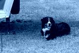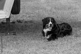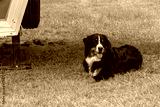 A mountain dog under a horse trailer