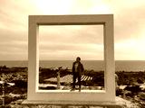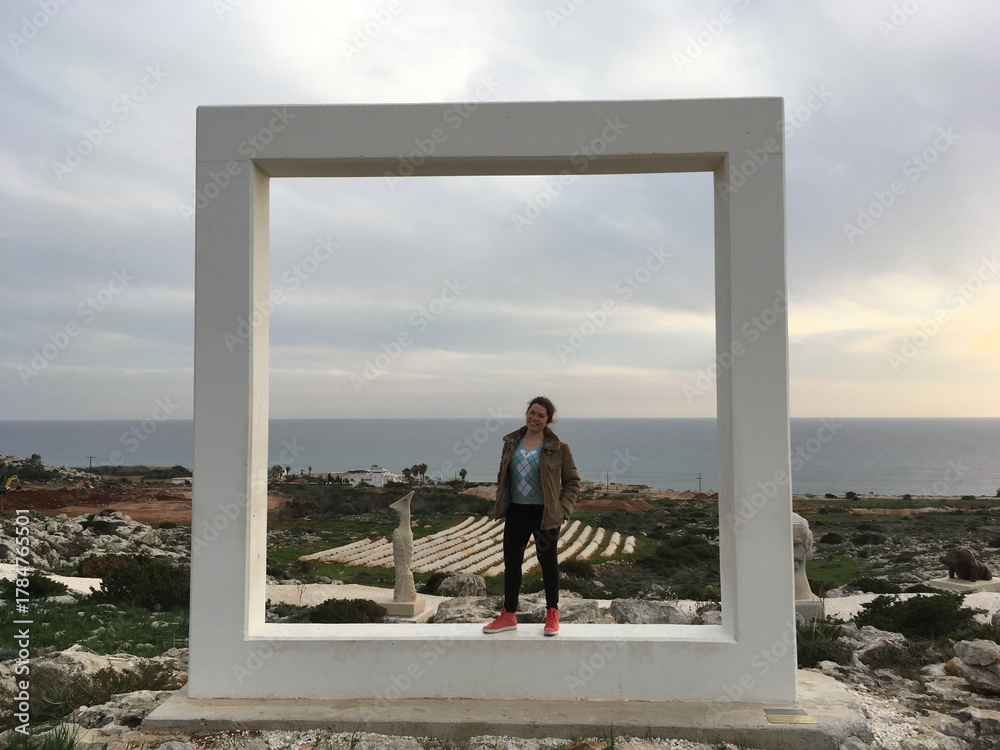 Woman posing inside white sculpture frame overlooking sea. Freedom, self-expression, and balance between humanity and nature.