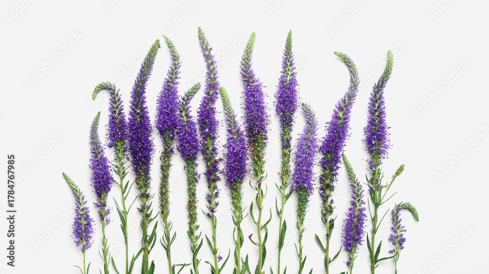 Natural blooming Purple flowers with green leaves as trend pattern on white background, minimal style aesthetic top view photo. Beautiful still life with wild field flower Veronica