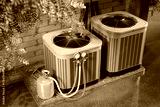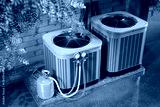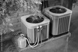HVAC maintenance with refrigerant gauges and gas cylinder connected to outdoor air conditioning units. Professional servicing for cooling efficiency and system performance.