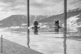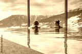Frauen im Urlaub geniessen Bergpanorama vom Pool aus