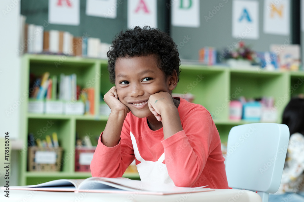 African boy sitting at his desk with smiling face in pre-elementary classroom, kindergarten, pre school education concept