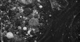 Bubble art. Ink water. Defocused pink purple white color dark black round oil texture glitter acrylic flow floating on abstract background.