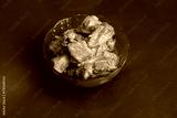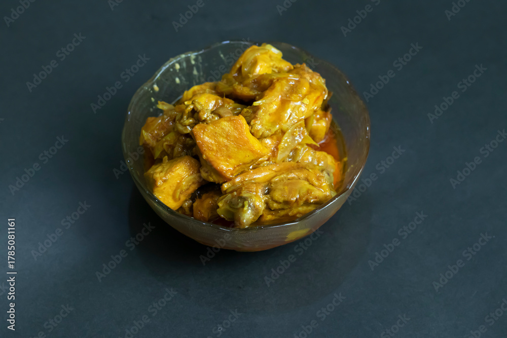 chicken curry, bathed in a rich golden sauce, presented in a clear bowl. Ideal for food blogs, menus, and culinary advertising to spark appetite.