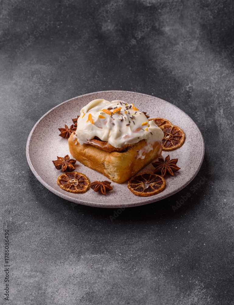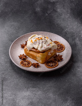 Cinnabon, a sweet cinnamon pastry, a high calorie bun or roll. Cinnabon with cinnamon