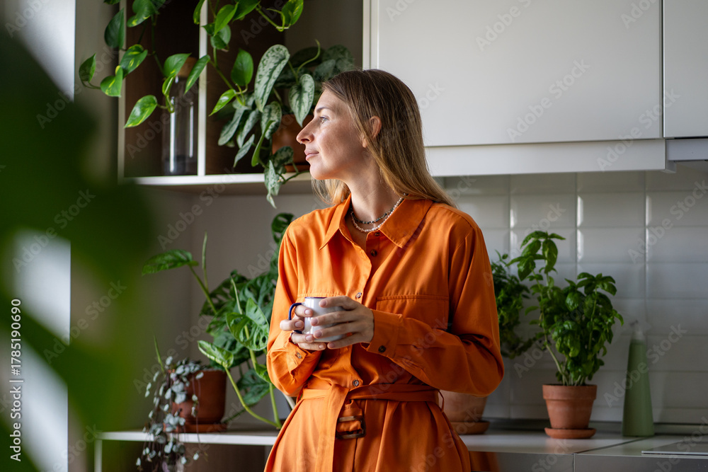 Relaxed uplifted woman enjoy hot drink beyond leafy garden in kitchen. Cozy home herb cultivation, female contemplative break, calm domestic stillness, aromatic plant surroundings for meditation rest