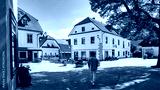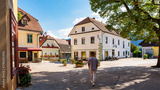 Tourist man from behind strolling through the pretty streets of Radovljica, Slovenia.