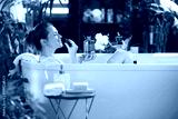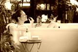 A smiling woman with closed eyes relaxes in a white bubble bath, holding essential oil bottles for aromatherapy. Lush plants & bath products create a tranquil, luxurious home spa for deep self-care.